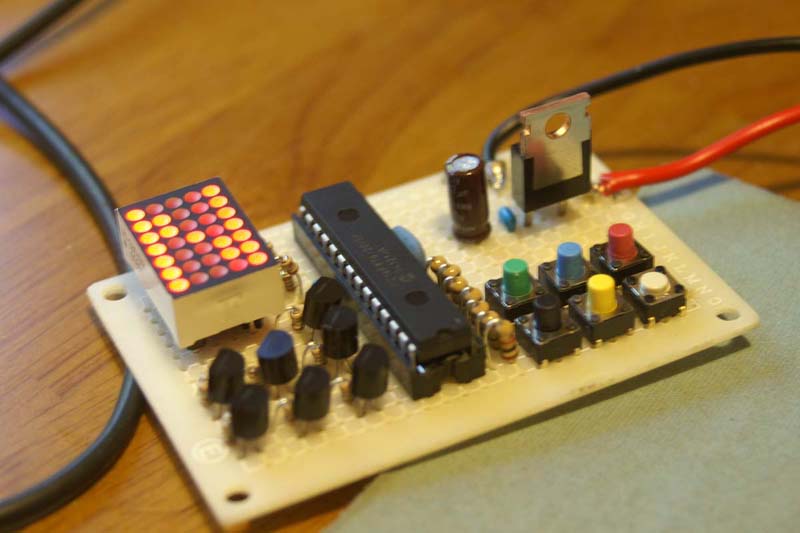 動かしてみました。ドットマトリクスのシフトインジケータの回路を流用したので線をつないでちょこっとプログラムを