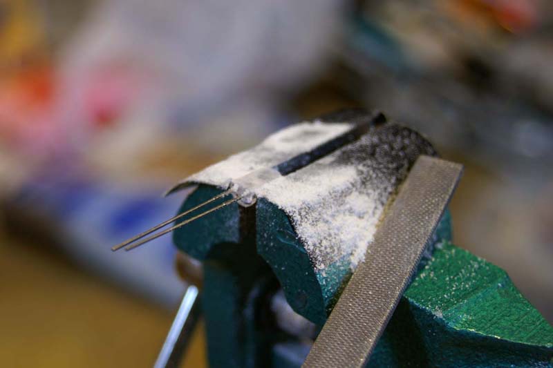 5ミリの赤色LEDを万力で固定して削ります。